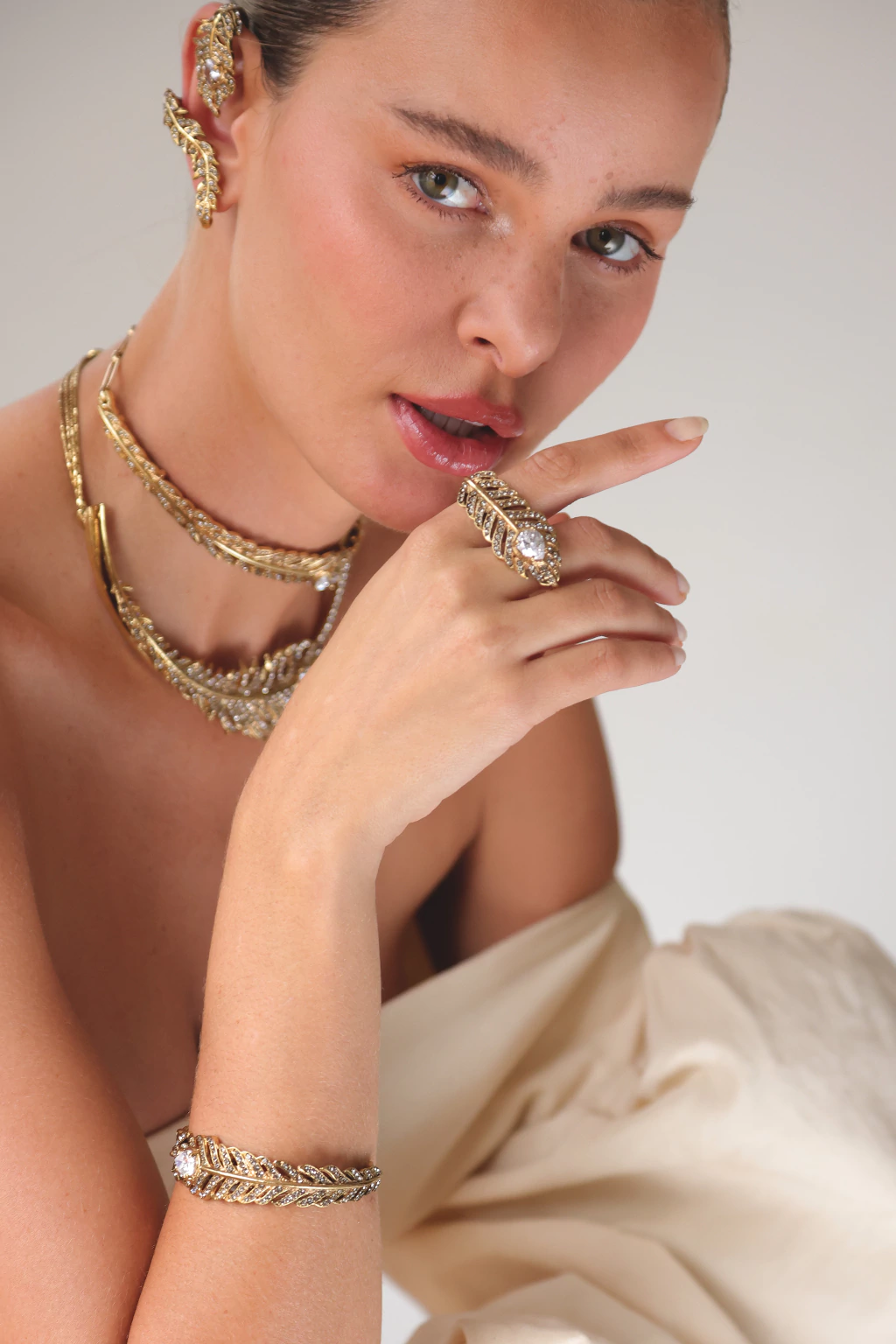 Cada peça dessa coleção foi pensada para não apenas embelezar, mas para envolver quem a usa em um toque de sofisticação discreta, como um segredoguardado entre os dedos. Os brincos e colares, com suas formas fluídas e leves,evocam o movimento das penas ao vento, enquanto os anéis trazem umaexplosão de brilho, como se cada pedra fosse uma estrela a brilhar em seu própriocéu.