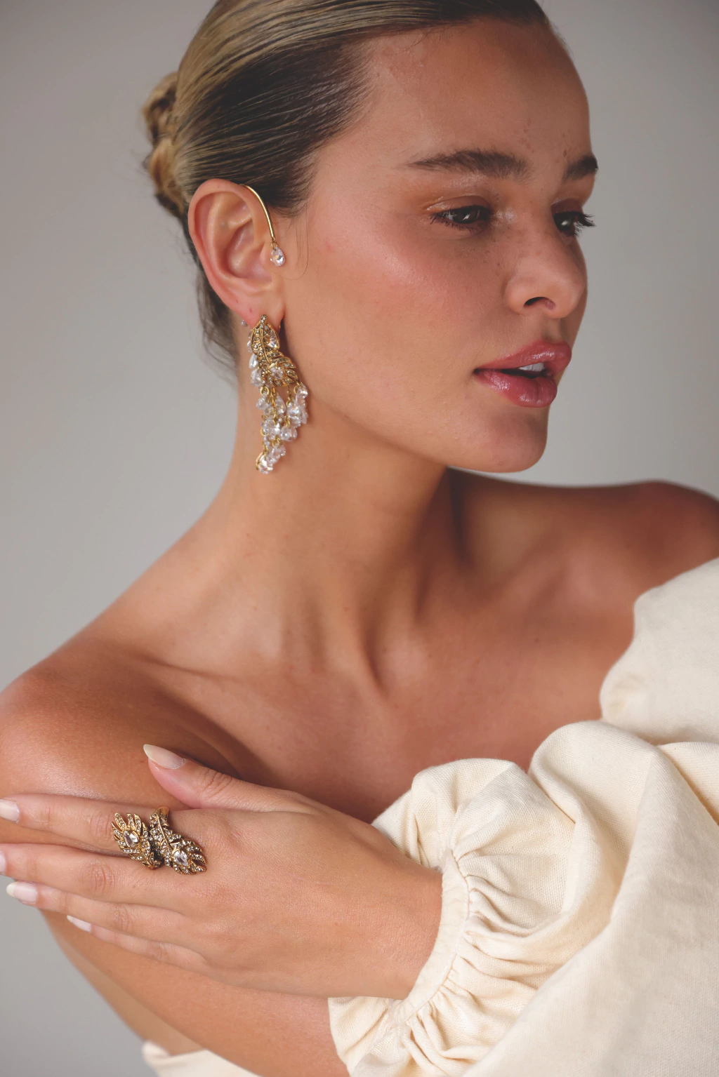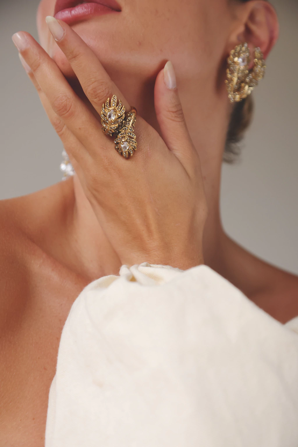 Cada peça dessa coleção foi pensada para não apenas embelezar, mas para envolver quem a usa em um toque de sofisticação discreta, como um segredoguardado entre os dedos. Os brincos e colares, com suas formas fluídas e leves,evocam o movimento das penas ao vento, enquanto os anéis trazem umaexplosão de brilho, como se cada pedra fosse uma estrela a brilhar em seu própriocéu.